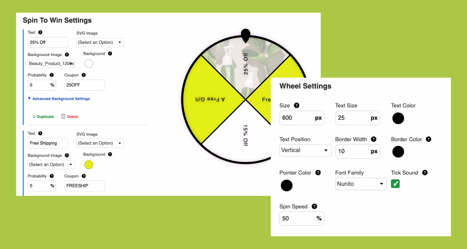 We also made outcomes easier to control. You can set probabilities, link slices directly to coupon codes, and add a “Next Page” action so you decide exactly where shoppers go after they spin.
