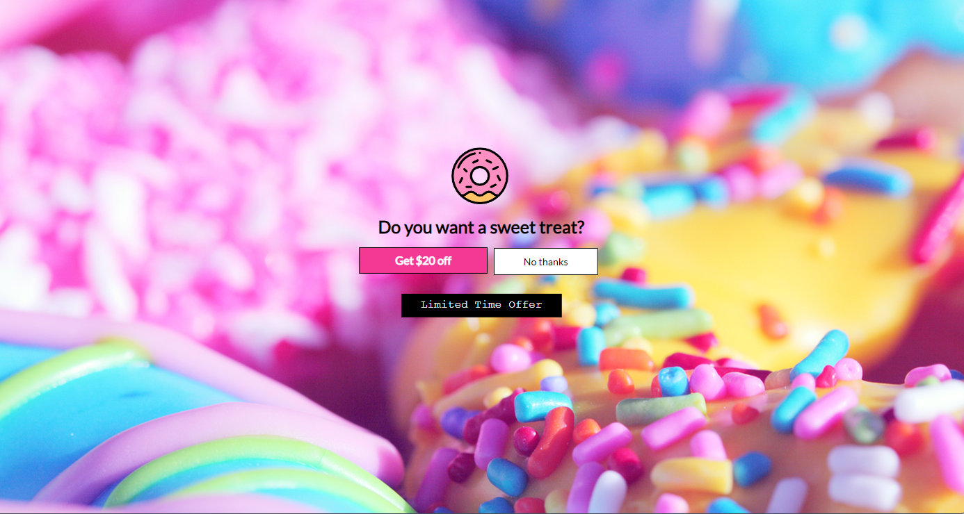 This is not a bland design. You can practically taste the colorful doughnuts. The emoji modernizes the offer as well, making it feel fresh and irresistible. Instead of a lightbox pop-up that covers part of the screen, this offer is a full-page takeover. This method fully engrosses the viewer into the moment of this offer.