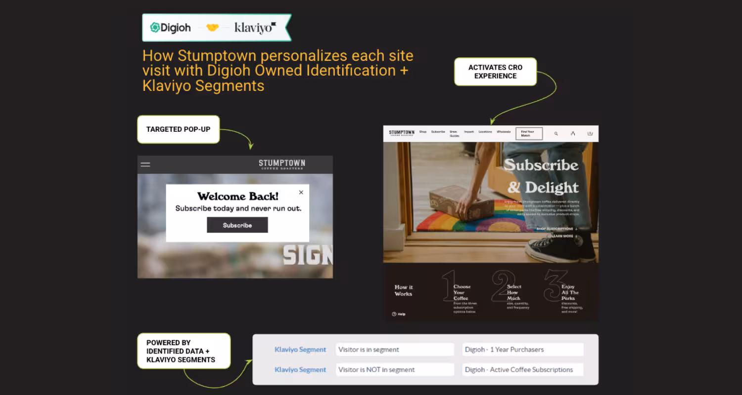 Brands like the iconic Portland-based Stumptown Coffee use Digioh’s identity-first personalization platform to collect preference data (flavor, brew method, purchase intent) and sync it with Klaviyo to power segmentation and subscription flows. This direct data fuels: