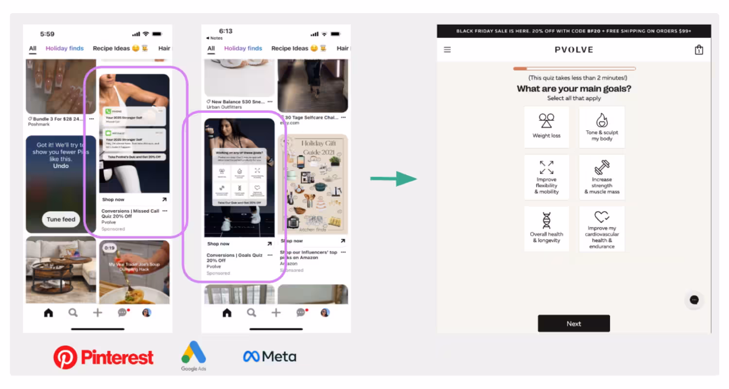 For example, Pvolve runs retargeting campaigns aimed at warm audiences—past site visitors and engaged users already in the funnel—to encourage them to take its Digioh-powered fitness quiz. This mid- to bottom-funnel strategy converts high-intent traffic through personalized quiz engagement. Because each segment is based on declared goals (e.g., strength, flexibility, recovery), ads drive higher click-through and lower cost per acquisition. Post-quiz data also fuels personalized landing pages, ensuring continuity from ad to checkout.