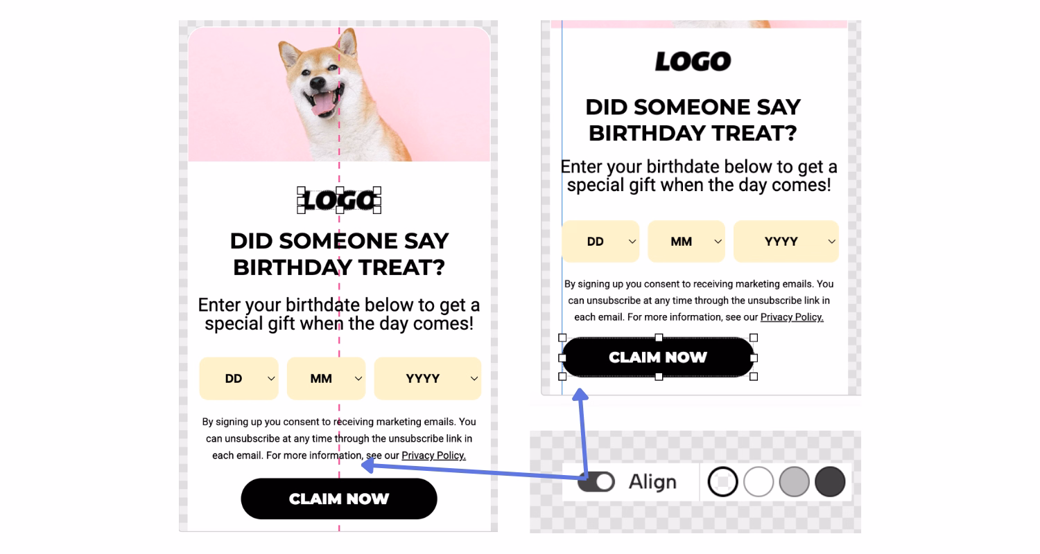 Easily align your campaign elements (images, text, buttons, etc.) as you drag and resize, on the campaign level as well as element to element. Snap to grid is there, too, if you like working on a fixed layout.