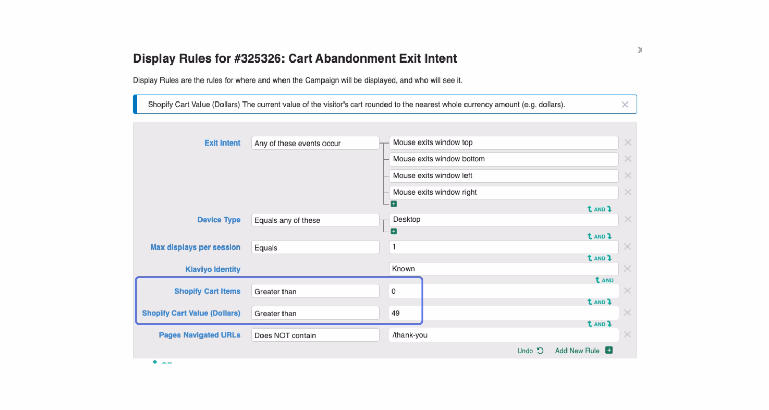 A few ways to put this to work: if someone's cart is just under your free shipping threshold and they're about to leave, show them a reminder. If their cart is empty and it's their first visit, offer a first-time discount and capture that email. If they're a known customer with items in their cart, skip the offer and just get them to checkout faster.
