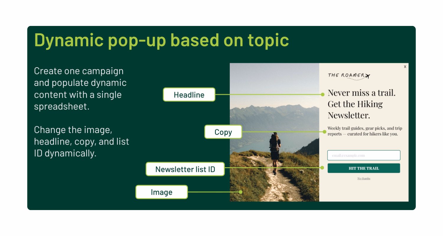 Every element in a Digioh pop-up campaign (text, image, button, CTA) can be swapped out dynamically based on who's viewing it. So you can create one campaign, and show completely different experiences depending on the visitor. Fallbacks are built in, so if a condition isn't met, the campaign shows a default version. Works across pop-ups, banners, sidebars, and embedded forms.