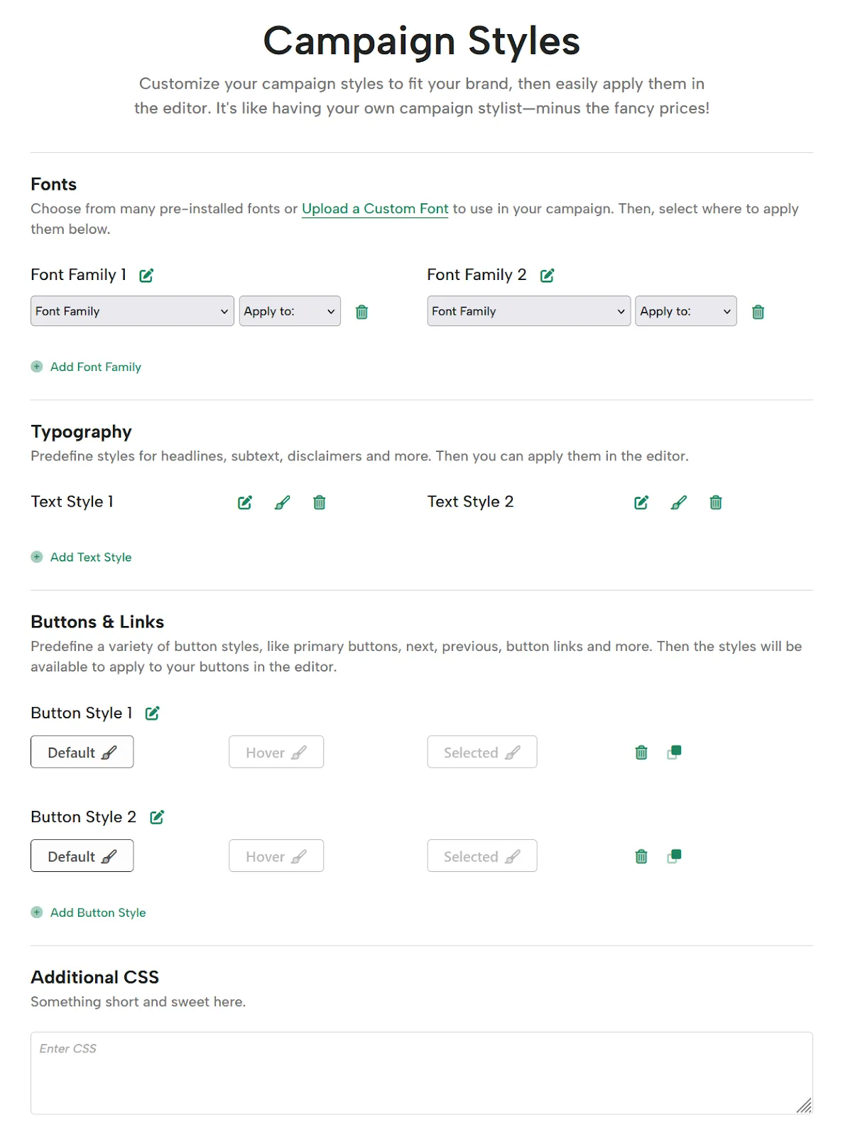 Our UI team has been hard at work on a prototype for the upcoming Campaign Styles Page. This will help you set the brand styles you need and apply them in the editor.