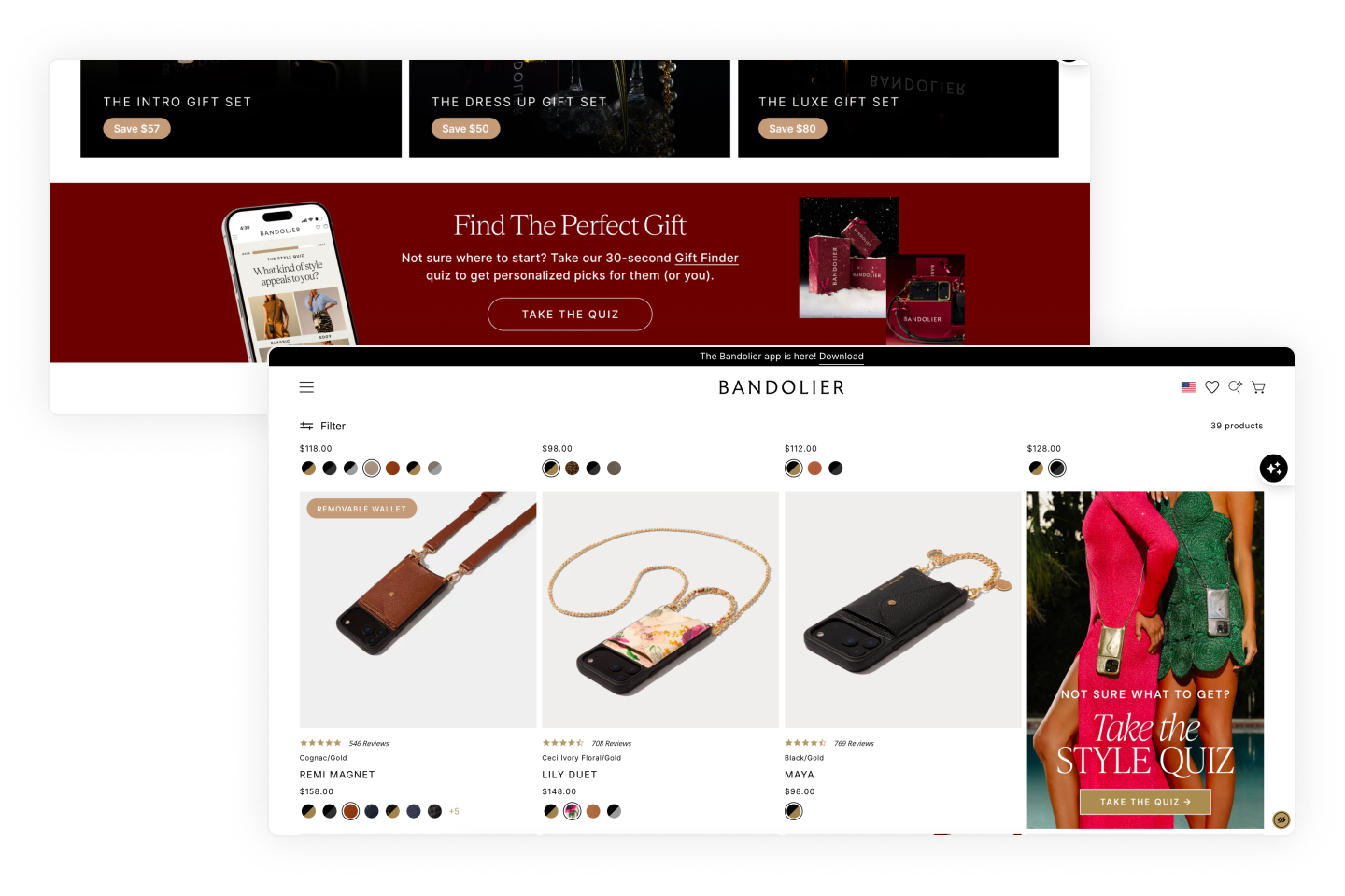 Bandolier drives traffic to both their holiday and evergreen quizzes with placements throughout the site. A homepage banner tees up the holiday gift finder, while the Holiday Edit landing page features an inline prompt to help shoppers narrow down gift picks. Meanwhile, the evergreen quiz is embedded on product collection pages to guide browsing into personalized matches.