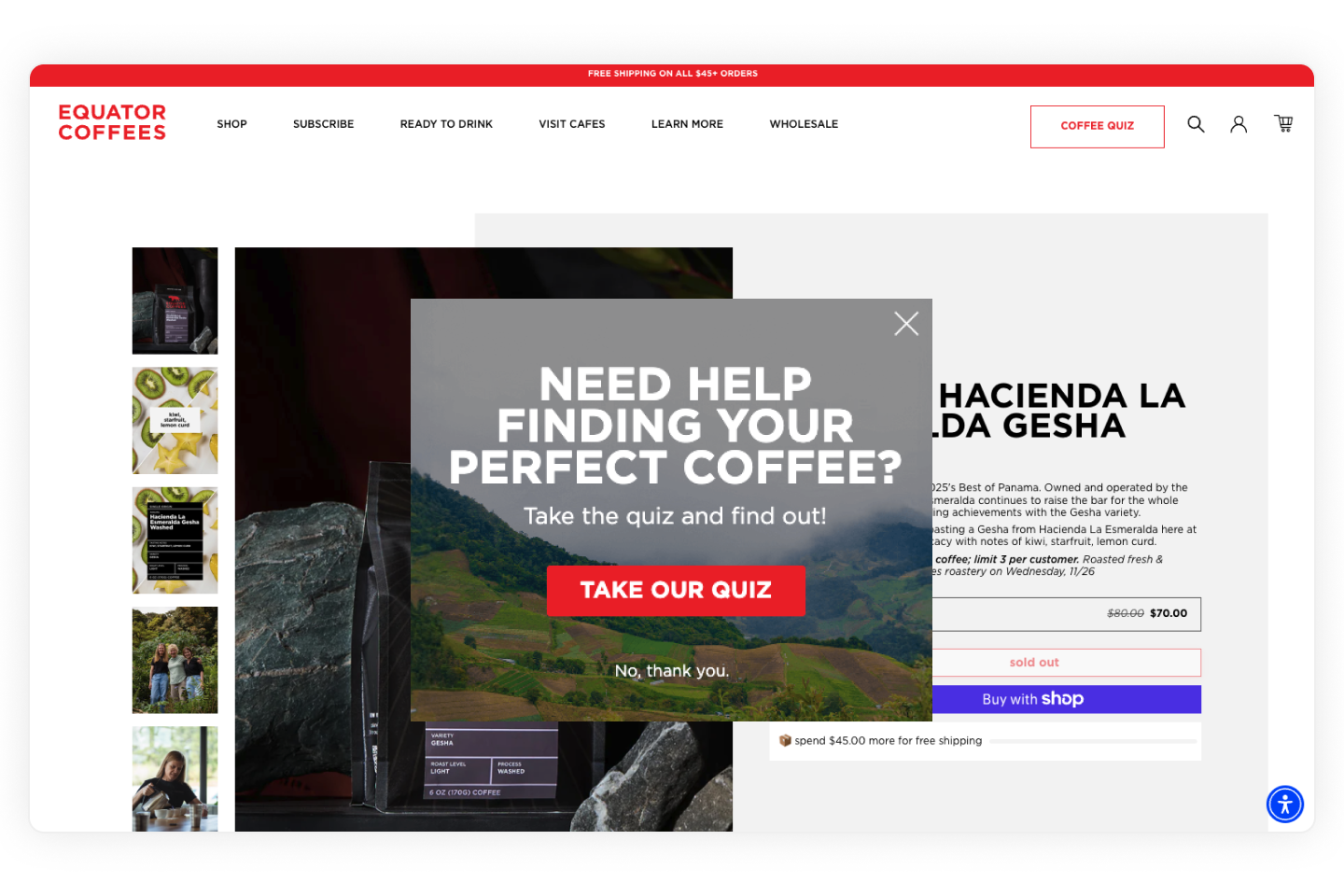 To re-engage indecisive shoppers, Equator launched a Digioh-powered exit pop-up inviting them to find their perfect coffee. It triggers based on specific display rules, like only showing after 2+ page views and avoiding quiz takers or visitors who've just checked out.
