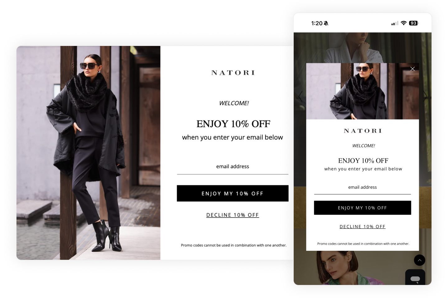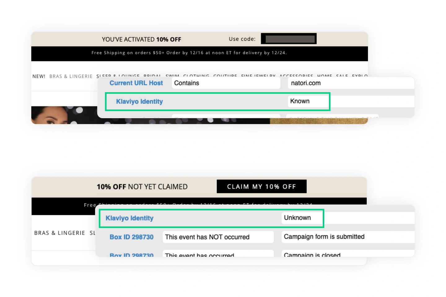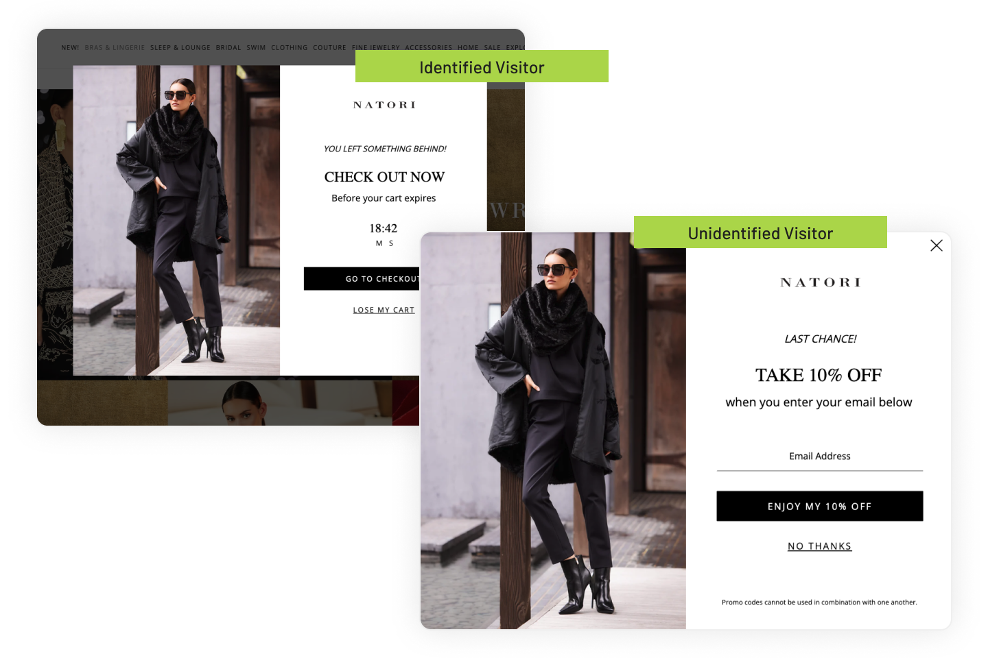 From cart reminders with countdown timers for known visitors, to list-building offers for anonymous browsers, Natori uses Digioh’s display logic to deliver the right exit message at the right moment. Each path maximizes conversion, while ensuring Natori collects more identities to fuel abandoned cart flows in Klaviyo (created and supported by their agency Sticky Digital).