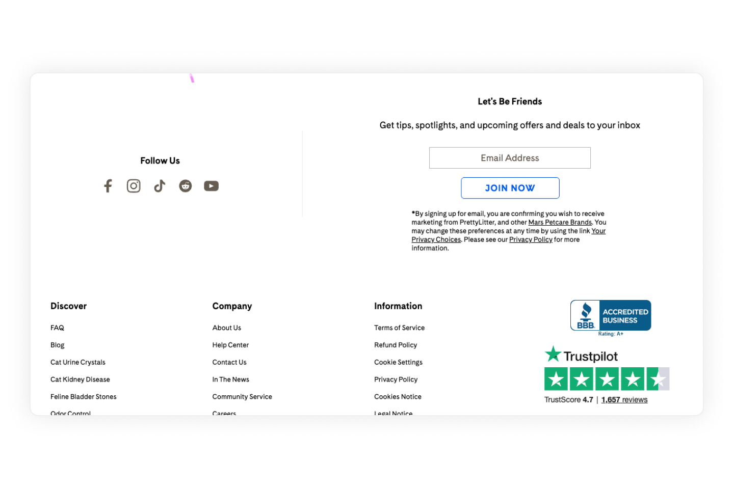Digioh’s inline footer embeds give PrettyLitter a seamless, persistent way to collect high-intent email opt-ins across every page. Customized by geography and language, they support steady list growth without disrupting UX.