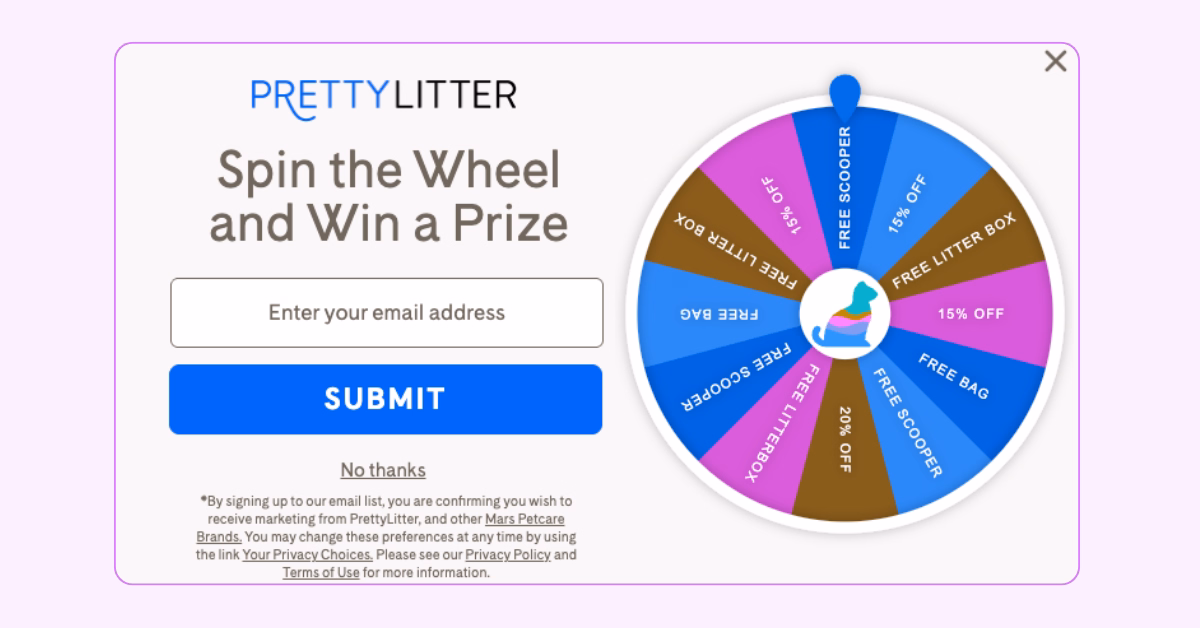PrettyLitter also uses Digioh to run multiple Spin-to-Win campaigns, turning static pop-ups into high-converting, gamified experiences that grow their email and SMS lists. Instead of treating these campaigns as one-size-fits-all, each is tailored by regions and audiences.