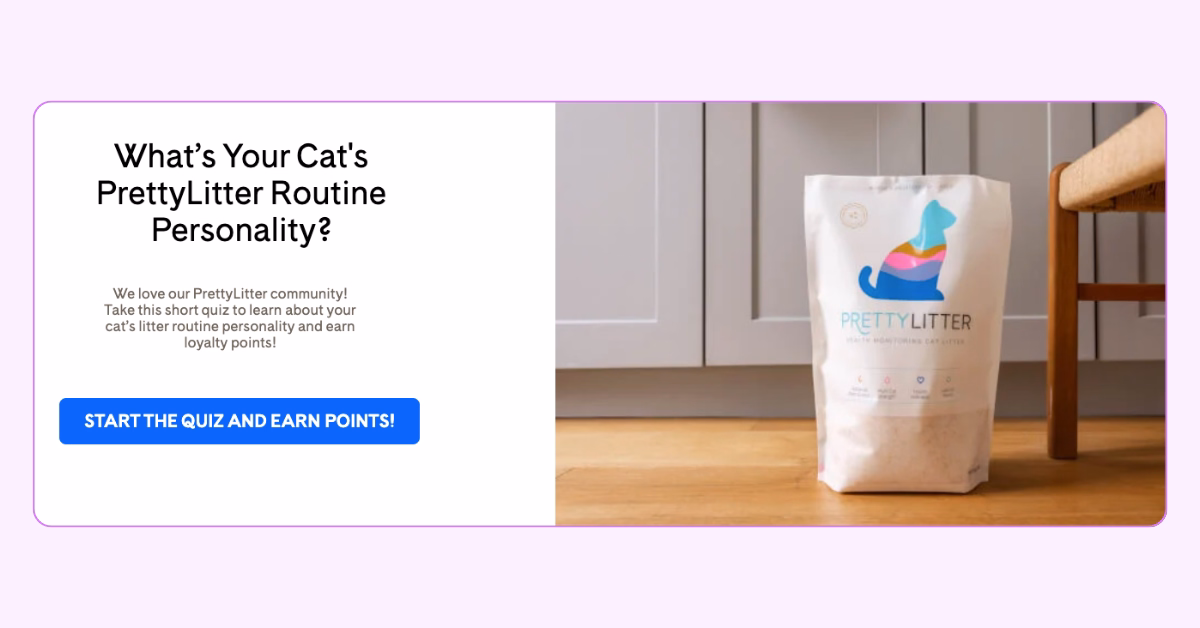 This unique quiz serves a dual purpose. By asking questions like how many cats are in the household, how often litter is changed, and what bonus perks customers prefer, it both delights shoppers and segments them by behavior, preferences, and pet needs. With a 90% completion rate, it fuels: