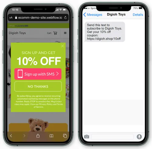 Grow your SMS marketing list with frictionless opt-in on mobile.